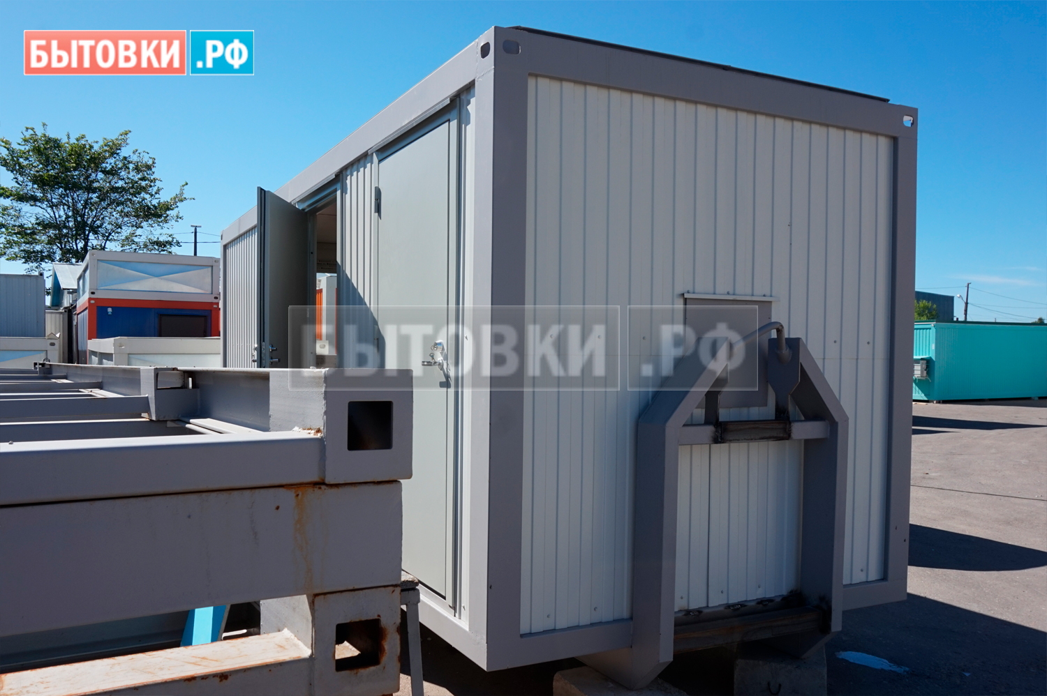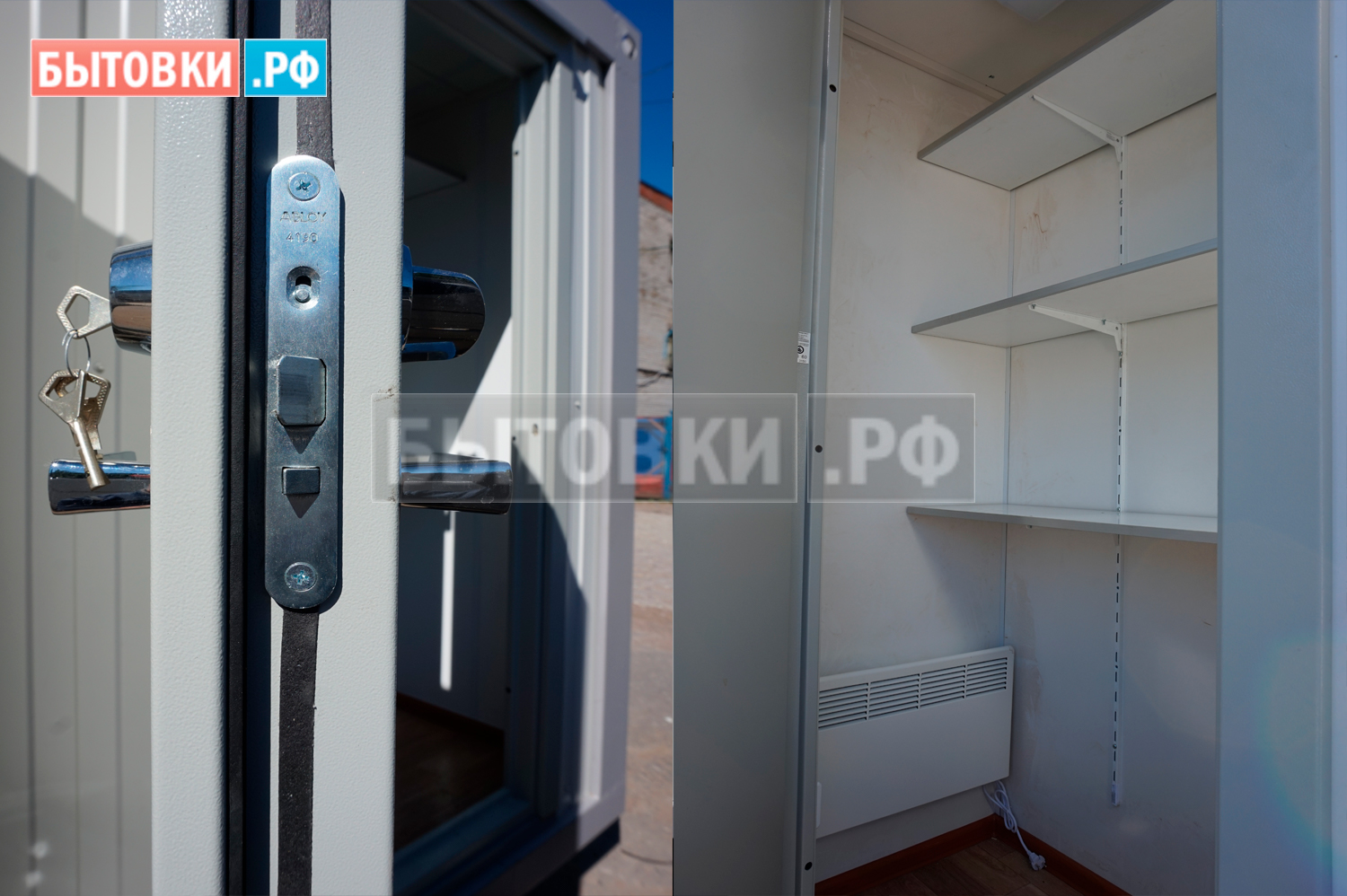3 навесные полки из ЛДСП 16 мм 1400х300 мм с возможностью перемещения по вертикали в складском помещении; отверстия для вилочного погрузчика в днище контейнера; умывальник Фея Мойдодыр с ЭВН 15 л – 2 шт.