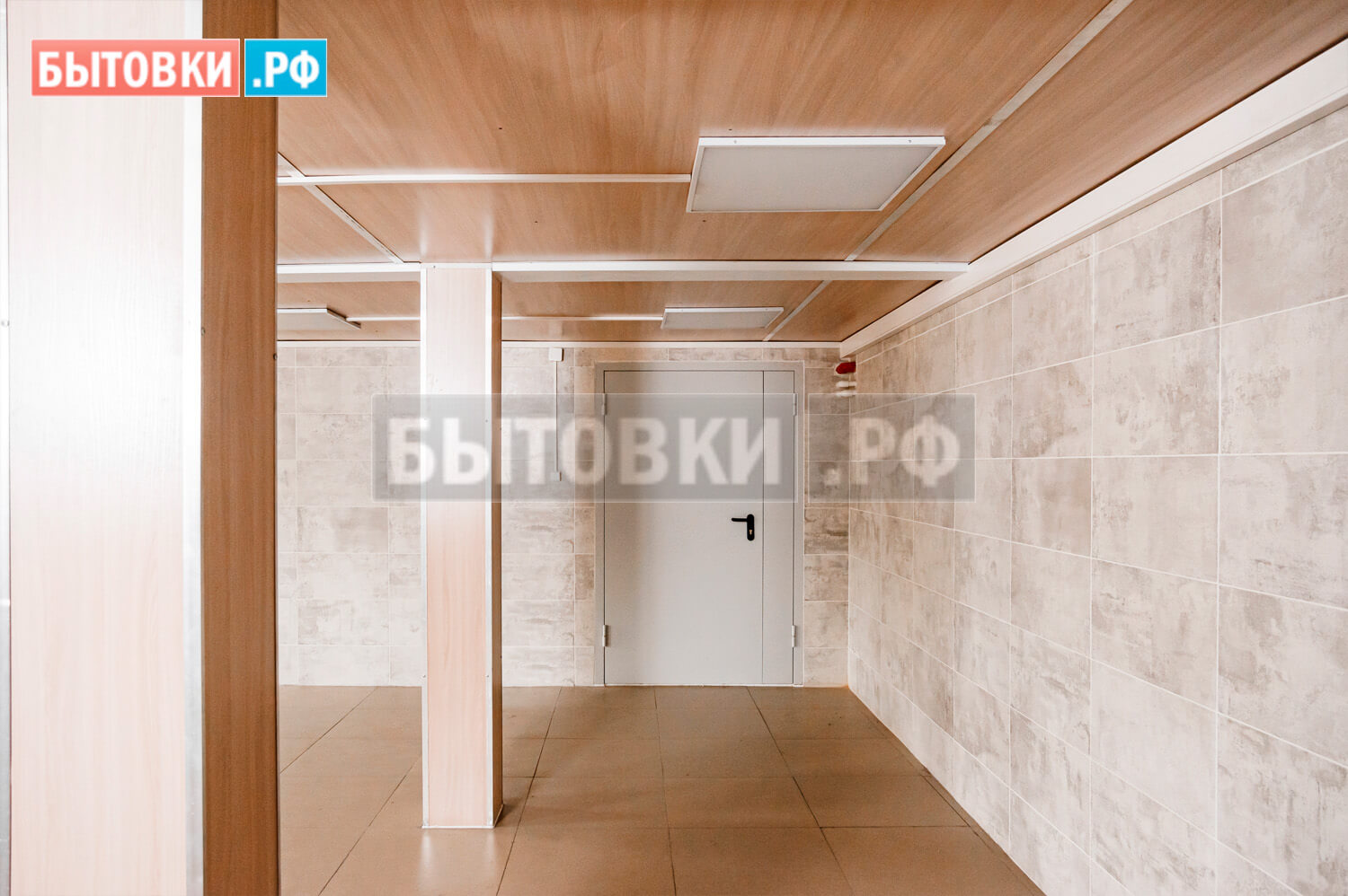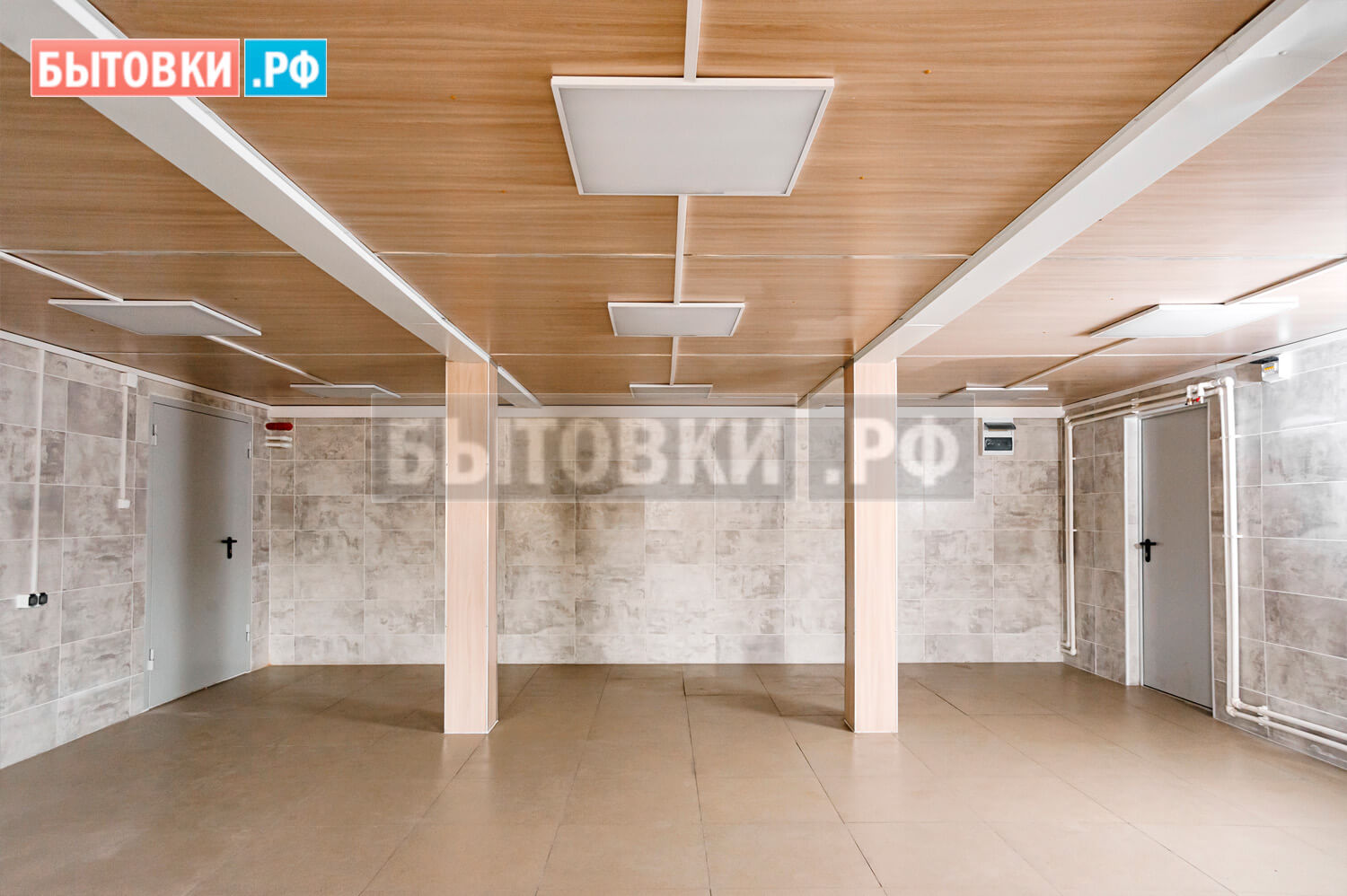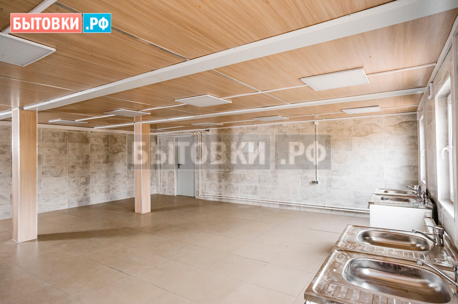 Потолочные лаги – деревянный брус 100x40 мм. с шагом 600 мм. 2 - 4 сорта естественной влажности; Поверх сплошная обрезная доска 100x25 мм. 2 - 4 сорта естественной влажности; Обработка огне-биозащитным составом;Кровля блок-контейнеров: